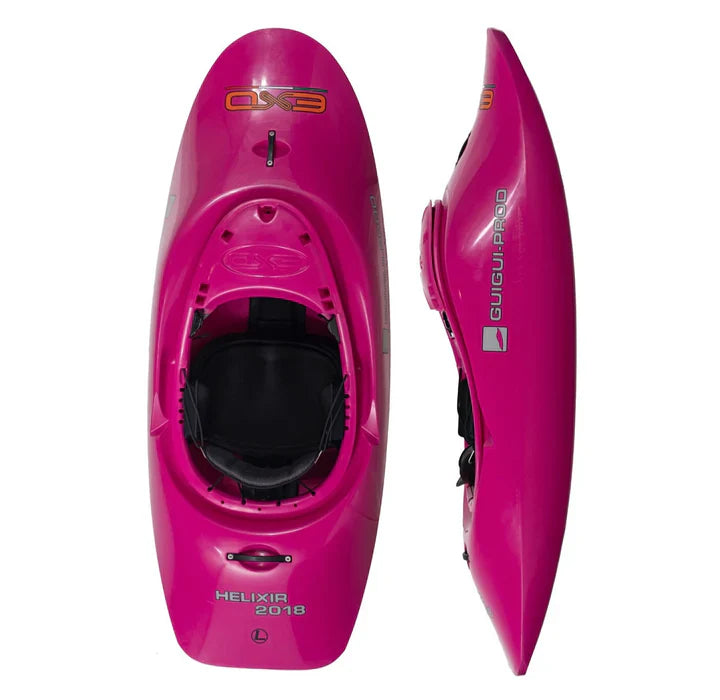 The EXO x GUIGUI-Prod Helixir. The ultimate plastic freestyle kayak, produced as the result of an incredible partnership between EXO Kayaks and GUIGUI-Prod. Designed by established and renowned boat maker Guillaume Respaud and World Freestyle Kayaking Champion Quim Fontané Masó. The Helixir 2018 is the plastic version of the design that Quim Fontané used to take home the title from the 2017 San Juan, Argentina Freestyle Kayaking World Championships.