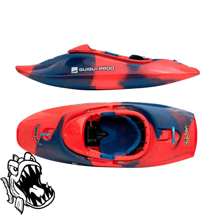 Pyranha Kayaks are delighted to have partnered with GUIGUI-Prod in order to do maximum, plastic-based justice to their next-generation freestyle design, the Helectron. Utilising the new Elite outfitting system and their latest polyethylene technology. The performance of which was proven during the recent Kayak Cross competition in Paris. Developed in collaboration with Team GuiGui’s freestyle heroes and with input from members of Team Pyranha, the Helectron features unique design elements. Such as the squared front edge, which allows for unparalleled control on the bow, setting it apart and providing a competitive edge.